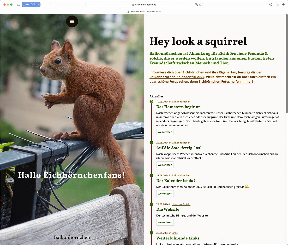 "Balkonhörnchen" startet im Spätsommer 2024 als kleines Herzensprojekt. Ich liebe Eichhörnchen und habe mein "Seelenhörnchen" kennenlernen dürfen. Ich habe Spaß an neuen Informationen, Webdesign, Fotografieren und Schreiben. All das kommt in diesem Projekt zusammen.