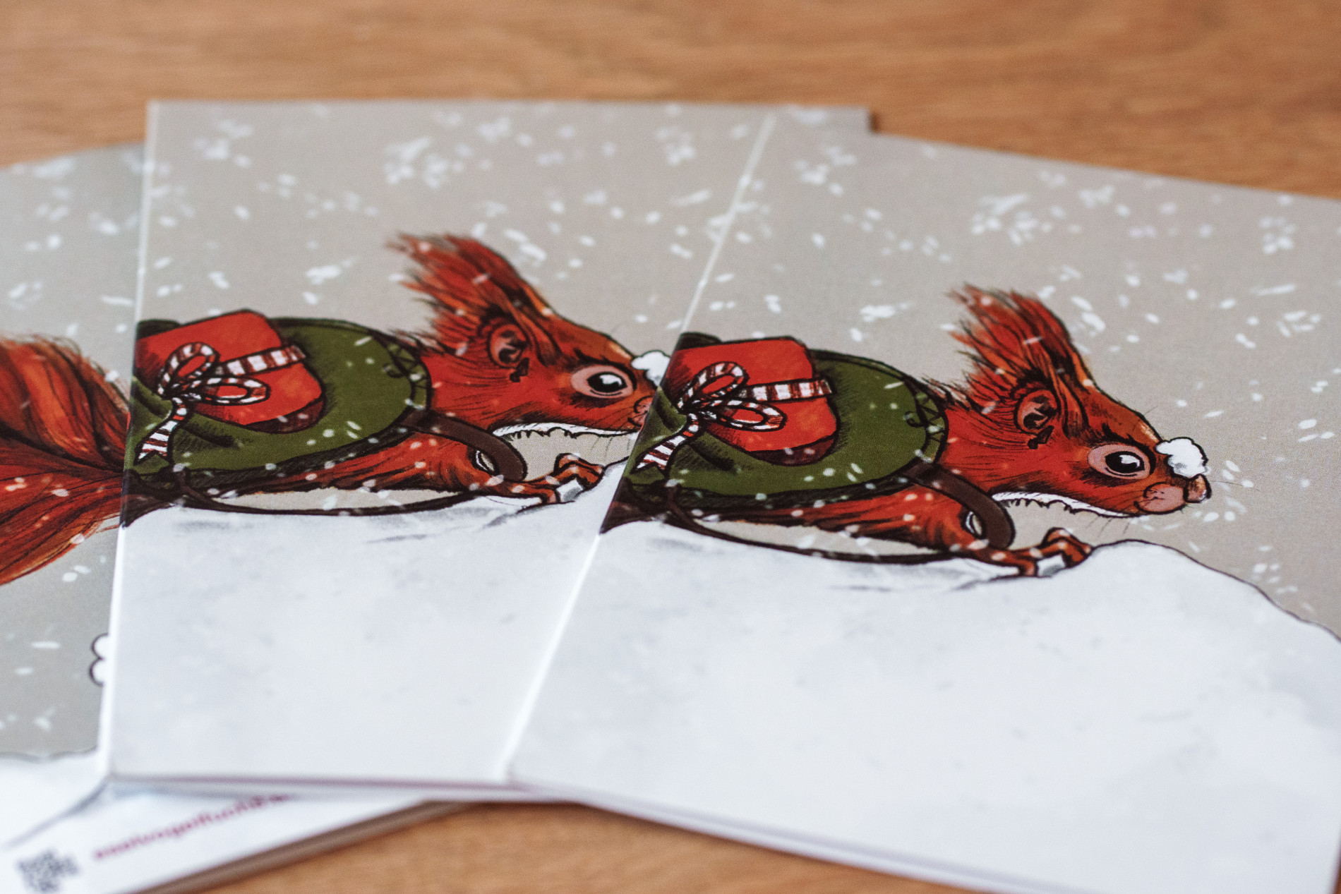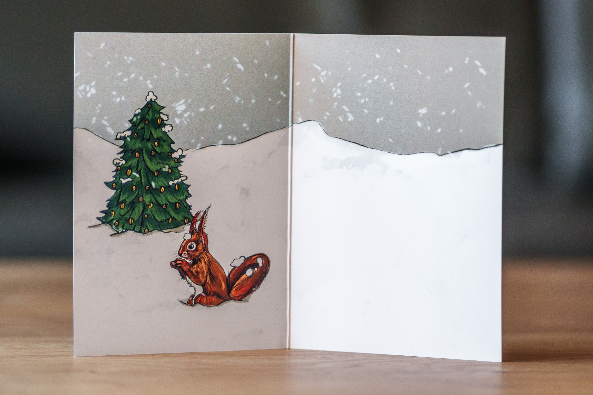 Das Motiv erstreckt sich über Vorder- und Rückseite der Klappkarte. Auf der Innenseite befindet sich links eine Illustration. Wie auf der Vorderseite bietet der Schnee auch auf der Innenseite viel Platz für eigene Grüße und Wünsche.