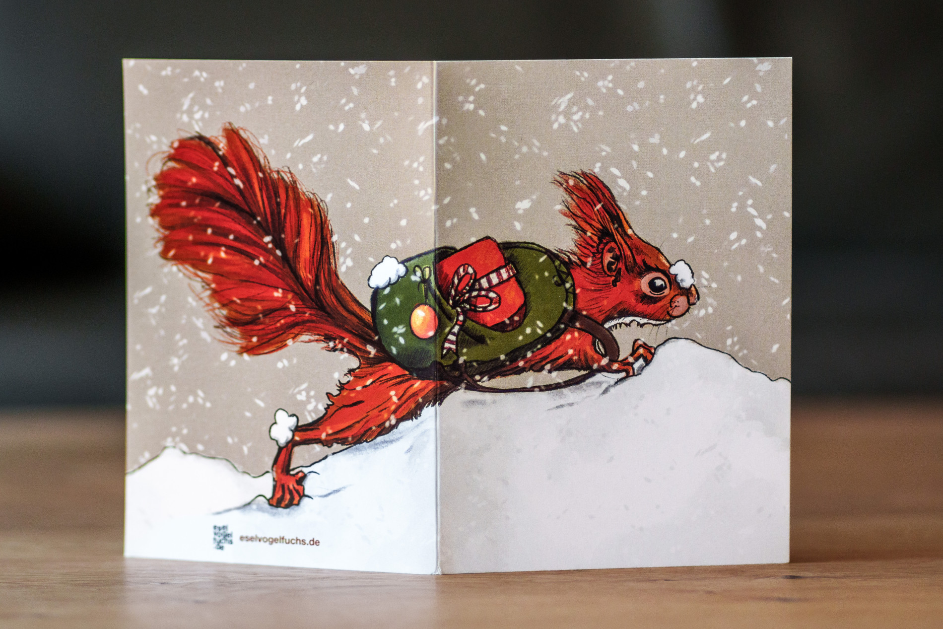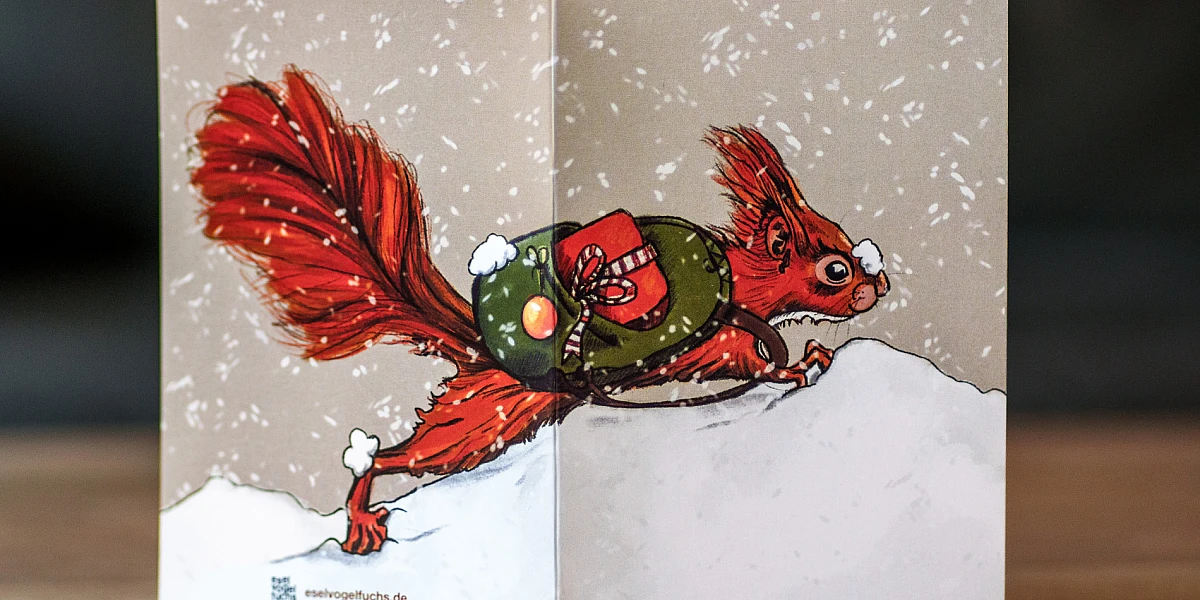 Ein Eichhörnchen, das sich beeilt, liebe Weihnachtsgrüße zu überbringen.
