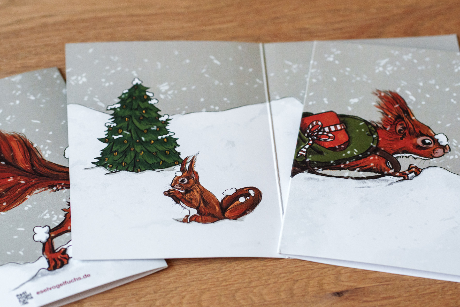 Die Karte hat das Format DIN A6 (105x148mm) in einer Stärke von 280 g/qm. Im Set befinden sich drei Klappkarten und drei passende Umschläge im Format DIN A6.