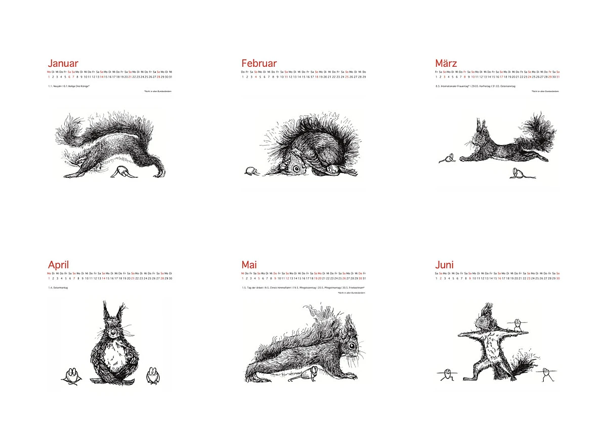 Es handelt sich dieses Jahr um einen Aufstellkalender mit Ringbindung dessen Illustrationen sich abtrennen und als Postkarte verwenden lassen. Im Gegensatz zu den letzten Jahren, entstanden alle Zeichnungen ausnahmslos für den Kalender - althergebracht mit Papier und Stift. Es gab keine Vorlagen für den Druck und keine Online-Bestellung. Mit der Druckerei Wollenschneider fand ich eine flexible und kompetente Druckerei.