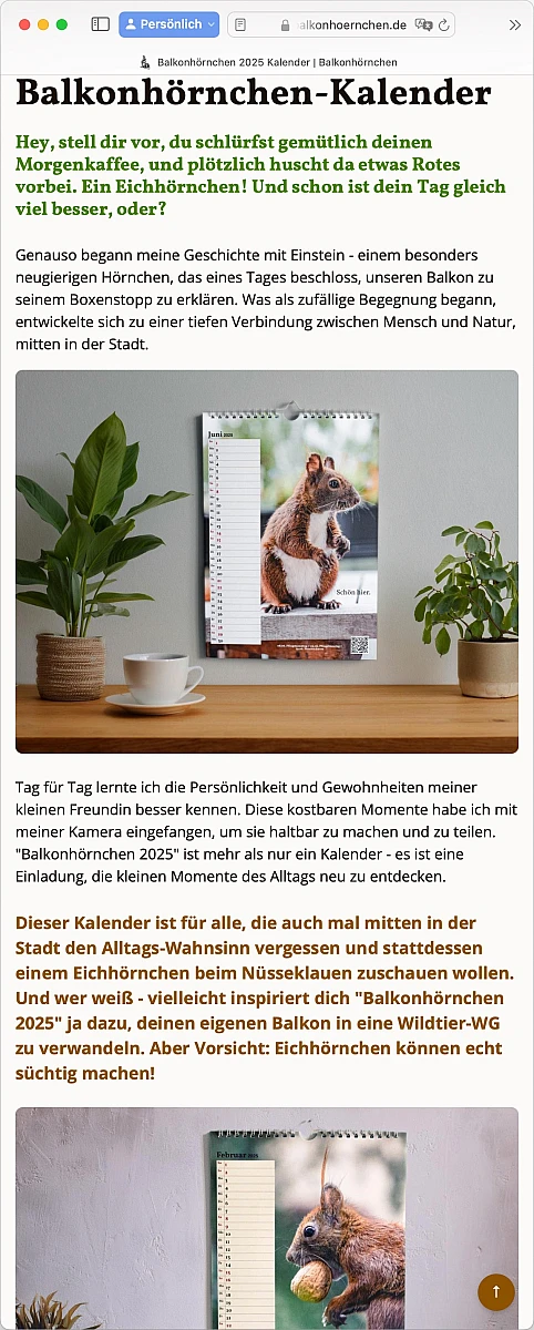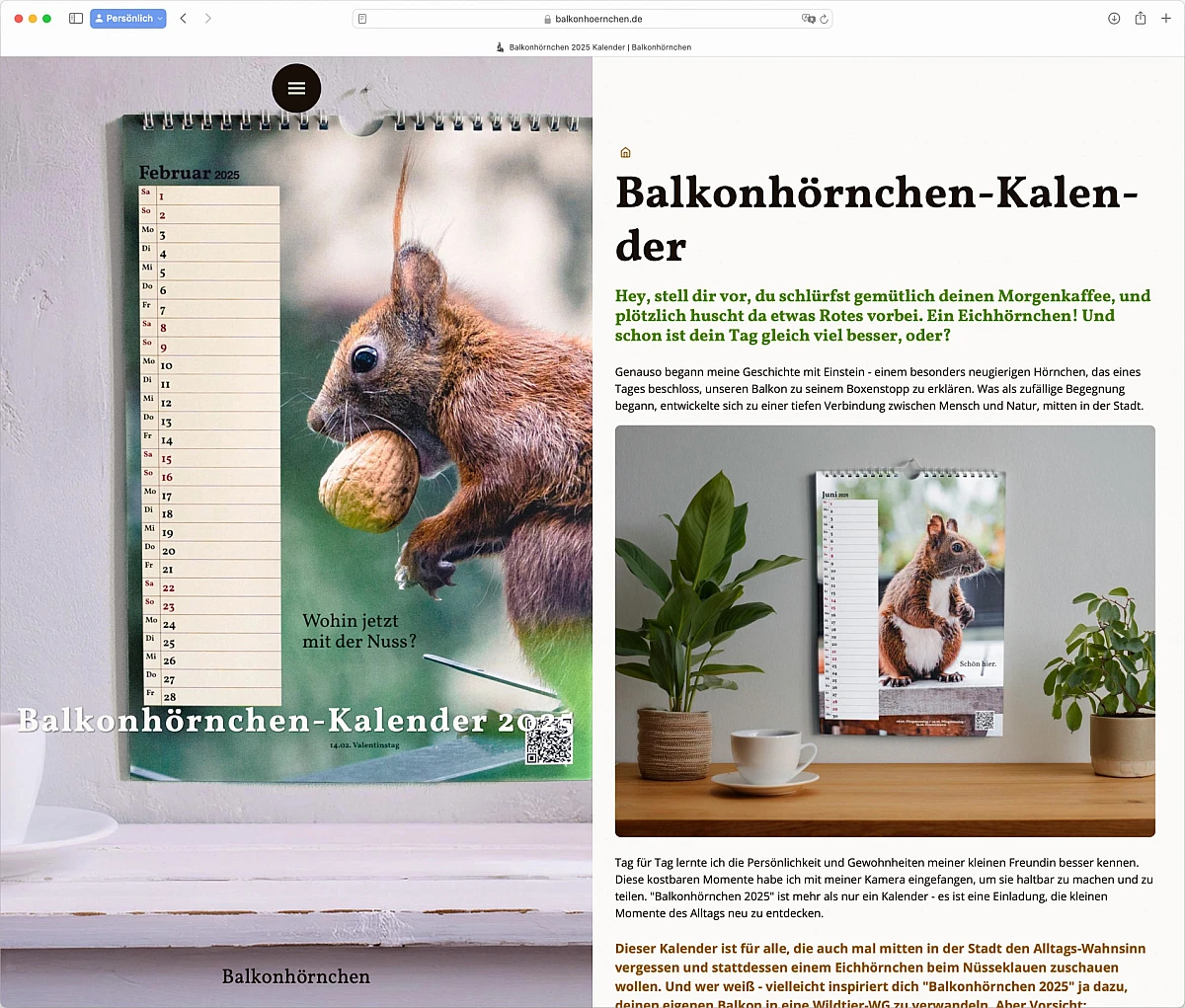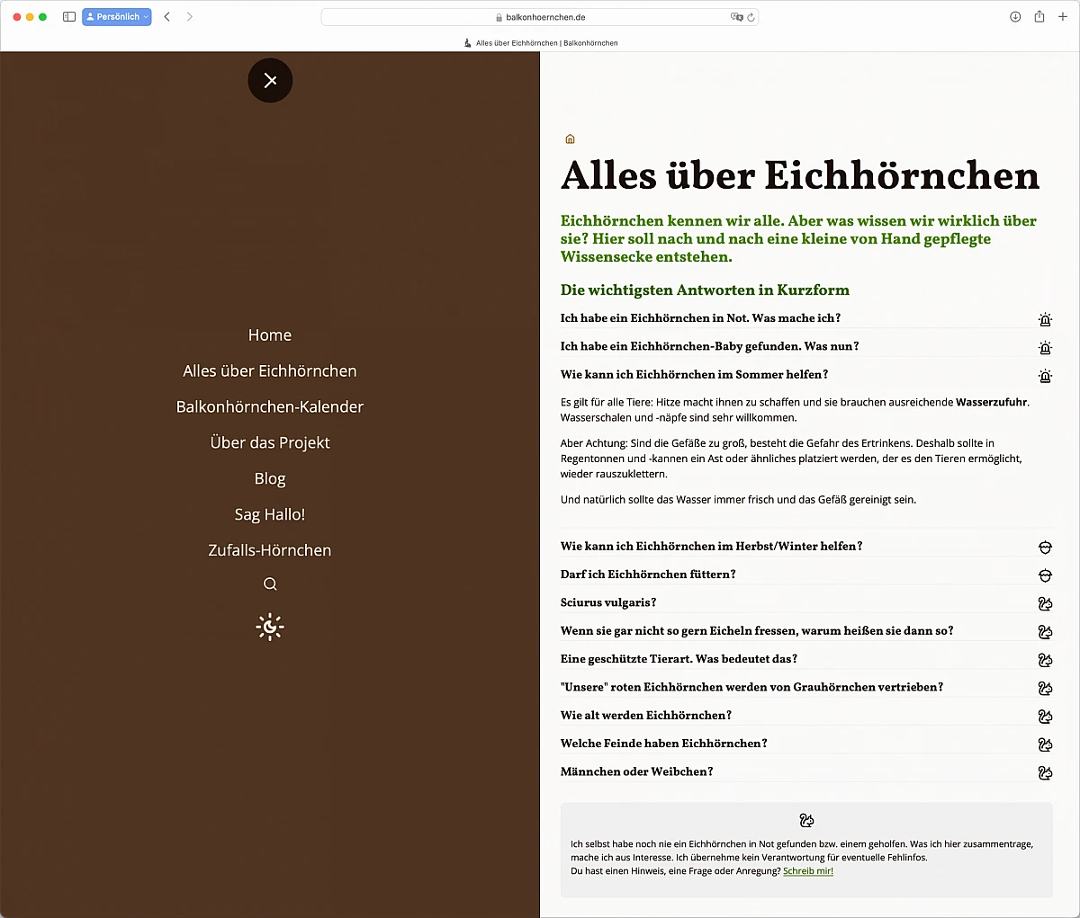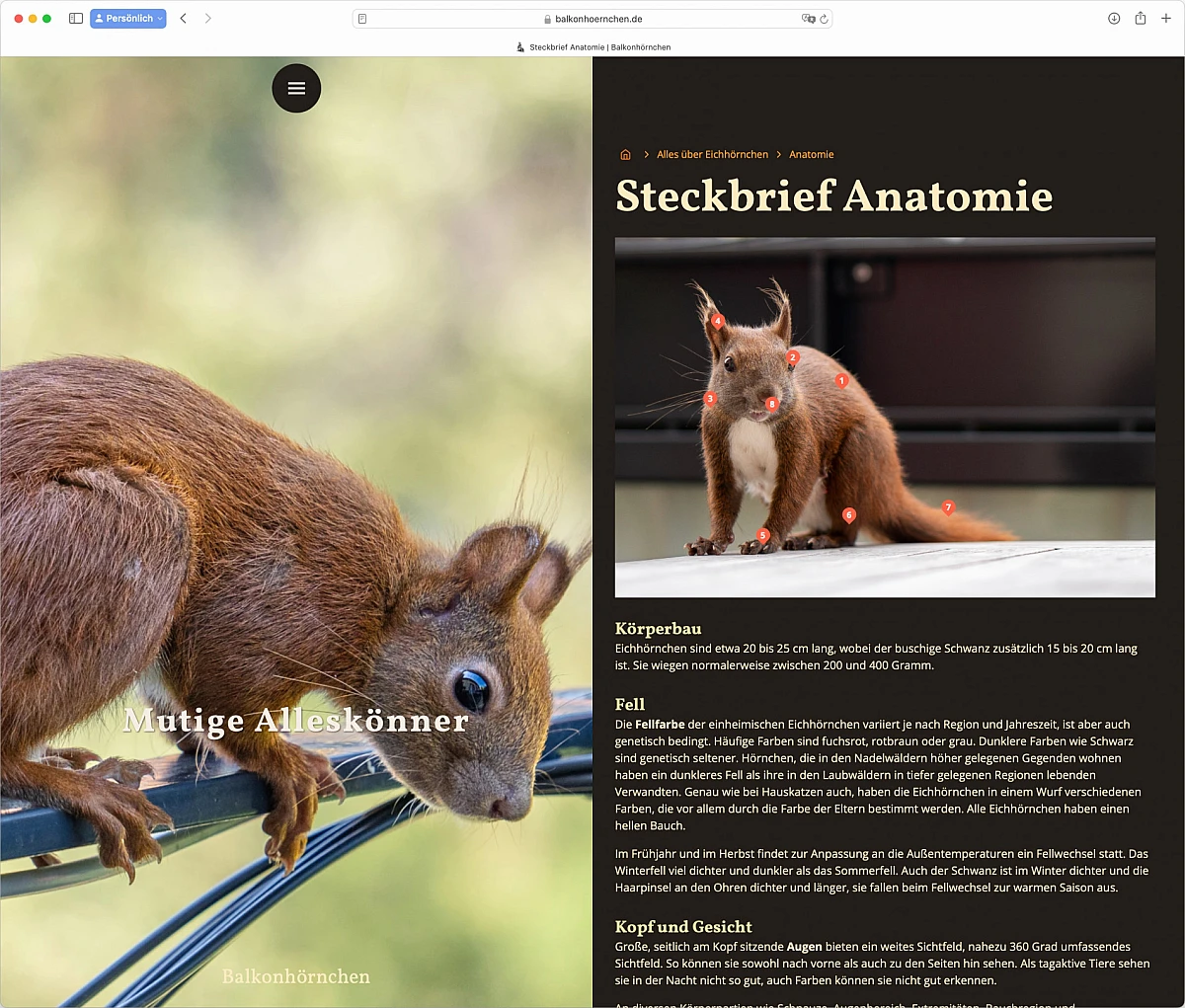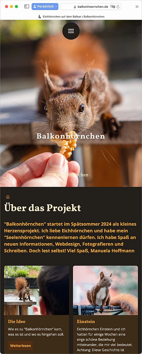 "Balkonhörnchen" startet im Spätsommer 2024 als kleines Herzensprojekt. Ich liebe Eichhörnchen und habe mein "Seelenhörnchen" kennenlernen dürfen. Ich habe Spaß an neuen Informationen, Webdesign, Fotografieren und Schreiben. All das kommt in diesem Projekt zusammen.